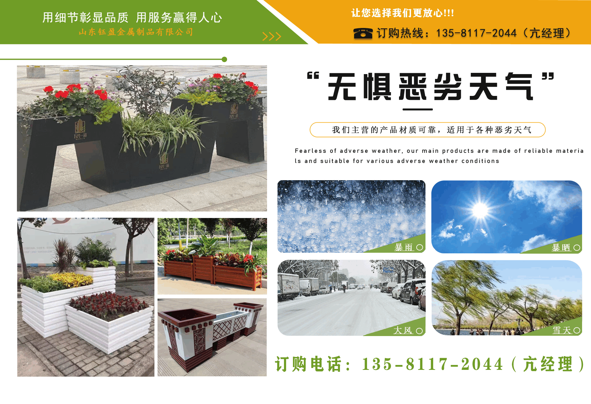 山東鈺盈金屬制品有限公司主營鍍鋅板花箱,道路隔斷花箱,定制花箱,戶外道路花箱,花箱座椅等產品,產品結構合理、性能優良,具有強度高、耐腐蝕、抗老化、隔熱隔音、節約能源、外形美觀、使用壽命長等優點,深受國內外客戶認可?! ∥覀兏鶕蛻羲诔鞘械奈幕卣?,制造出符合當地城市文化氣息的自然立體、觀賞性強的花箱產品成為城市里一道靚麗的風景線。 公司實行誠實、公正、守信、價格合理、平等互利。 公司憑借雄厚經驗實力,恪守誠信為本的原則,得到了眾多客戶的信賴,并在業界獲得良好的口碑。建立了穩固的合作關系,隨著業務的不斷發展和壯大,合作伙伴的范圍也在不斷擴大。我們熱情盼望與您的合作,為社會的可持續發展獻上一份努力。...